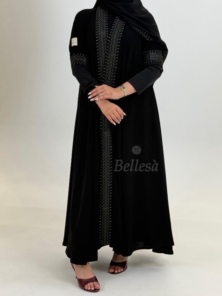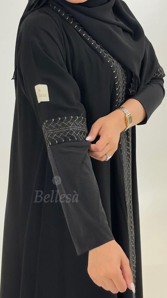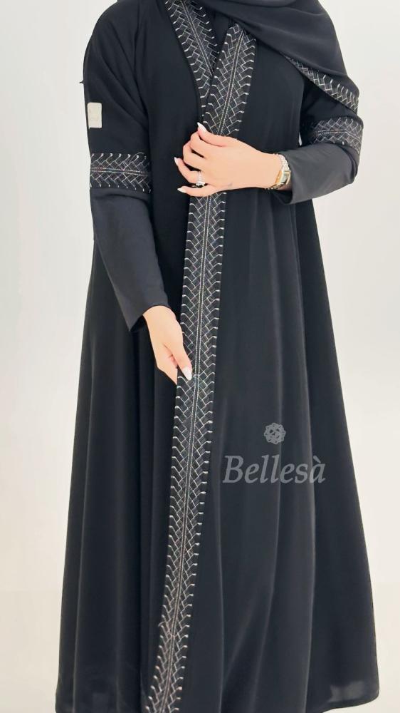 قماش ملكي كوري فاخر سواد فاحم تطريز الامام مع الاكمام لون اسود مضاف عليها اسوارة استرتش( عباية عملية وناعمة ).